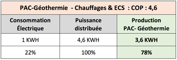 Ainsi, grâce à des choix judicieux en matière d’investissements « Écologiques », nous avons pu porter le Coefficient de Performance Énergétique du Bâtiment COPEB, qui lie la performance Thermique de l’enveloppe structurelle du bâtiment à la production énergétique du système PAC-Géothermie, à la note de COPEB = 6, ce qui signifie que pour 1 KWh facturé, le bâtiment dans son ENSEMBLE, distribue 6 KWh de puissance consommable par le client.