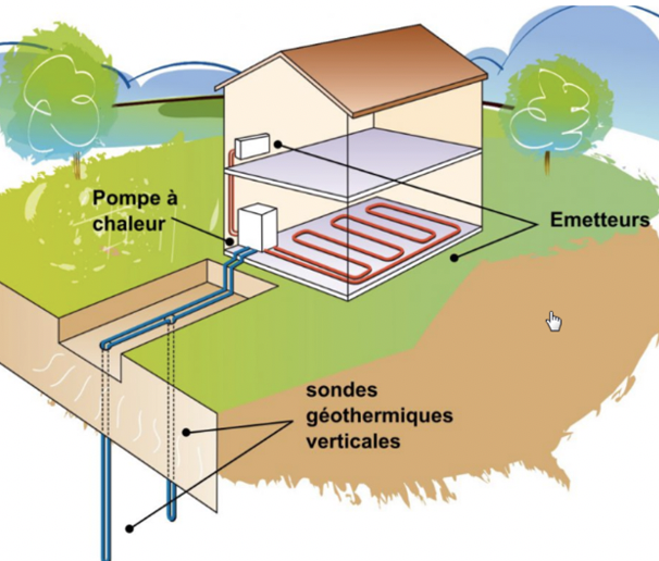 Une première sonde envoie l’eau pompée dans la nappe phréatique vers un échangeur thermique afin d’en extraire les calories et renvoie l’eau à sa provenance par la seconde sonde.